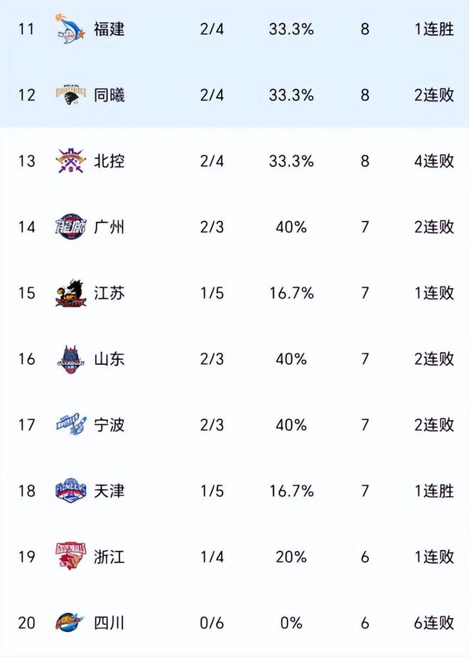 随着天津队拿下首场胜利之后,联盟全败球队仅剩四川队,这支昔日总冠军也是唯一一支开局6连败的球队,排名从倒数第二重回倒数第一。
