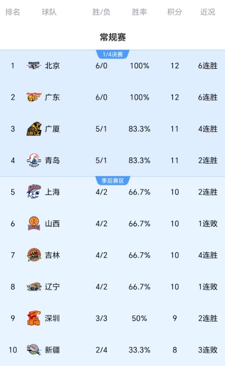目前,北京队、广东队继续保持全胜战绩,稳居积分榜前二。